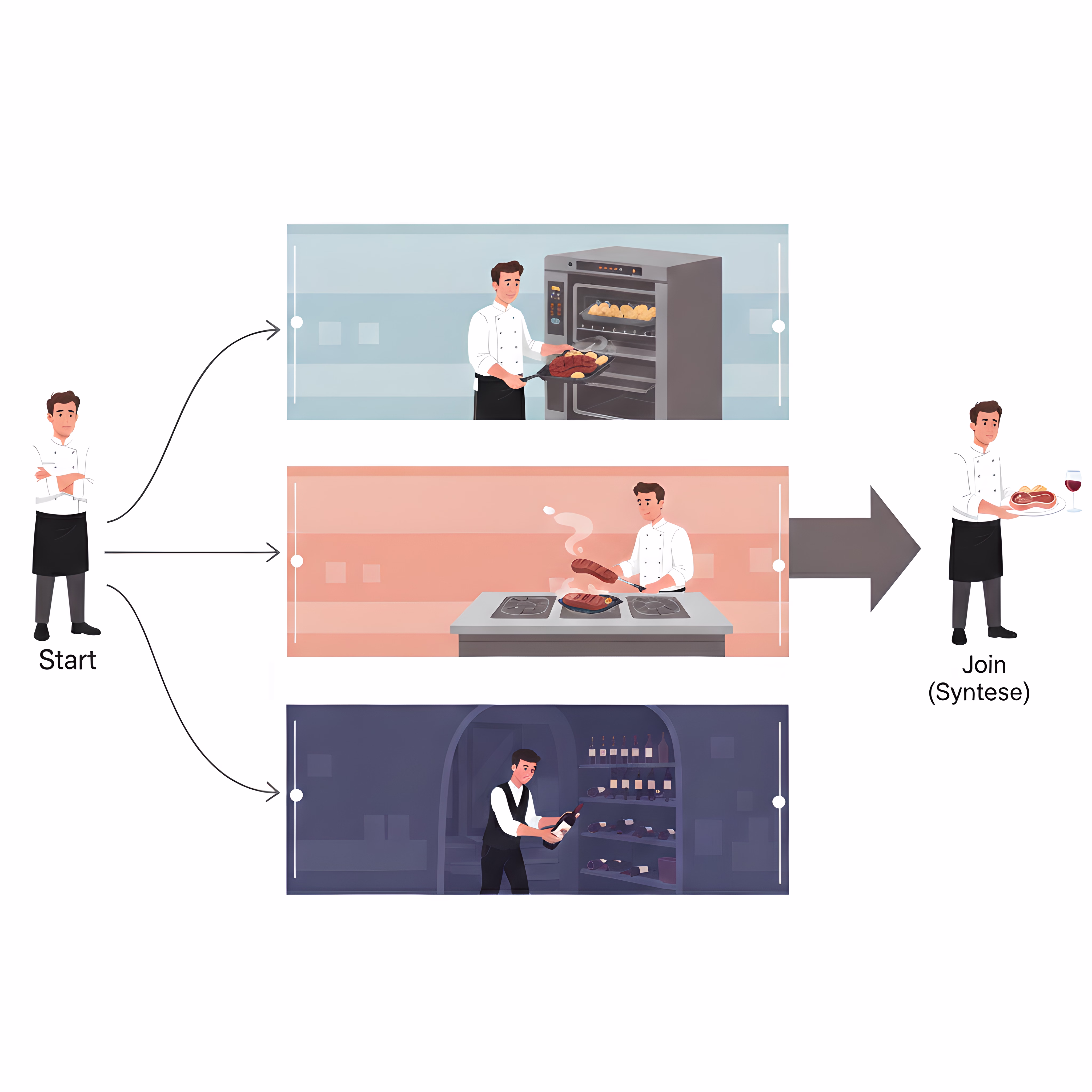 Erinnerst du dich an unsere Restaurantküche? Der Workflow eines Profikochs ist ein perfektes Beispiel für das Fork and Join-Modell:
